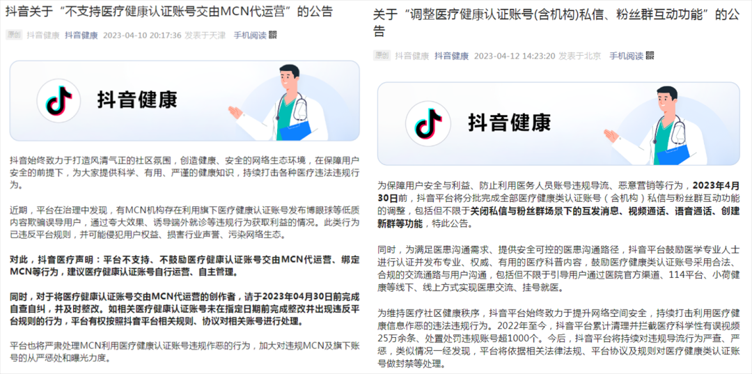 一个企业的成败不会主导一个行业兴衰,只是可能会加速行业的发展或者是带来巨大的影响,各行各业都有其自然发展规律,没有A也会有B,没有B也会有C。所以如果抖音再过度延续这种政策,自废武功时,很多的MCN、商家包括医生就会转向别的渠道,比如视频号、快手、哔哩哔哩、小红书、百家号等其他平台,继续开始全面的拓展,这也是非常有意思的地方。