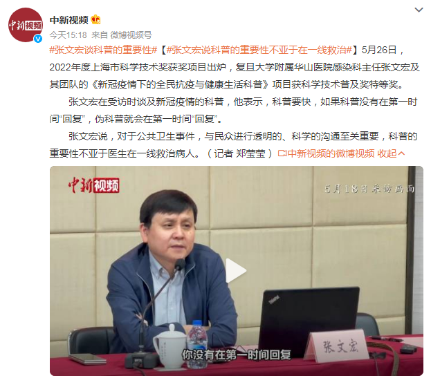 5月26日,2022年度上海市科学技术奖获奖项目出炉,复旦大学附属华山医院感染科主任张文宏及其团队的《新冠疫情下的全民抗疫与健康生活科普》项目获科学技术普及奖特等奖。