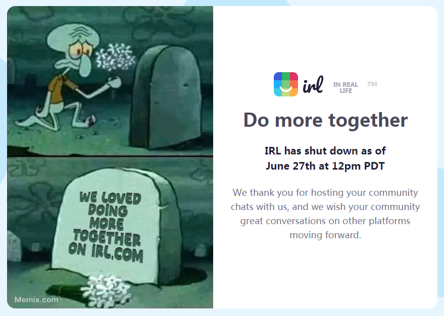 目前,IRL官网已显示“6月27日中午12点关闭”。IRL应用程序已从iOS应用商店中删除。