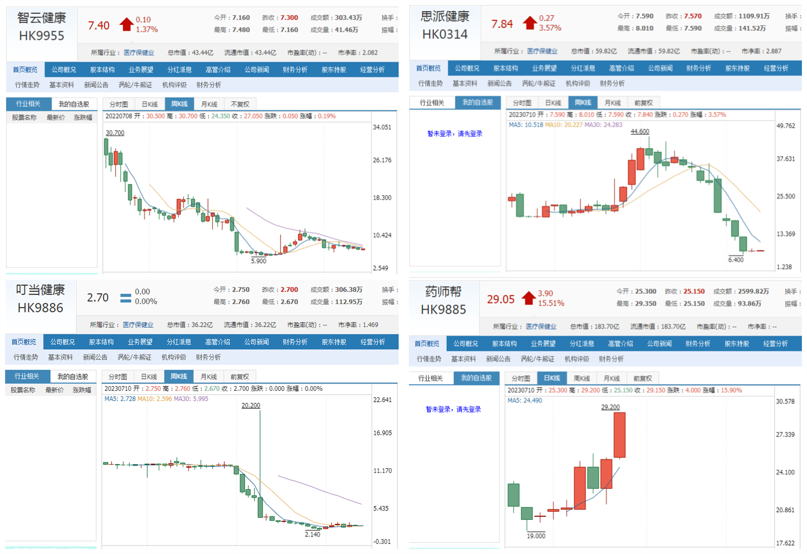 几家医疗健康企业“迷你发行”的股价走势都是先向上突破一下,然后平台整理,随后等快到第一批解禁的时候,就会大幅向下破位往下,平均跌幅60%左右,曾经最大跌幅90%!目前刚上市不久的“药师帮”股价走势还处在第一阶段的上涨中,不过药师帮最近一期的现金流是正的,跟其他几家不同,当然未来是谁也无法准确判断的,资本市场专治各种不服!