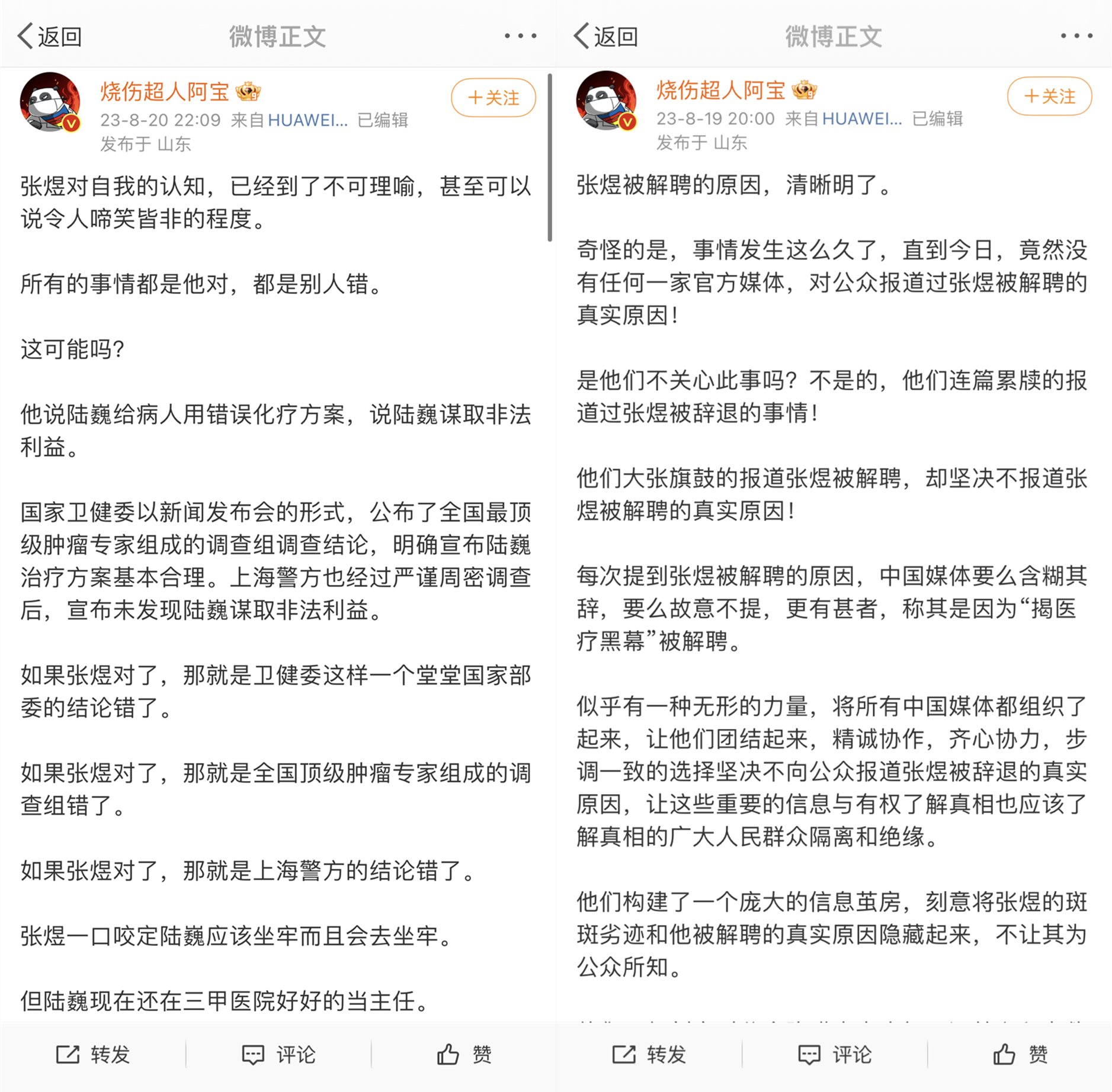 医疗大V烧伤超人阿宝最近在社交平台多次发文,表达了对张煜医生的不满。