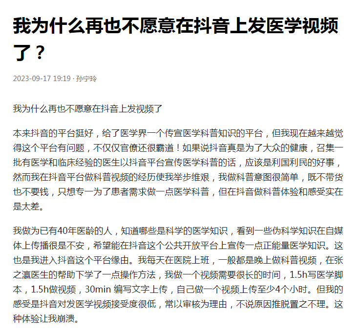 Dr.2也是一名临床医生,非常能理解孙医生对疾病和药名的谨慎,有时候医生就是顺口说了一种药品,甚至临床医生都不觉得有推销的成分在,只能说明药企的工作做得好。但是各个平台有不同的规则,在快手、头条、西瓜视频能发出来,并不代表所有平台都可以这样,抖音的用户体量相对会比较大,所以它定的规则会比较严格,特别是之前医疗内容受过监管之后,它定了一个矫枉过正的规则。作为短视频运营,通常是需要了解和遵守的。所以专业的人干专业的事情,孙医生自己就是专业人士,更应该能明白这一点,然后用自己辛苦的付出和反复纠结,只不过是证明了一个你本该“应知应会”的道理而已,什么经验教训都谈不上,只是因为不懂,所以就抱怨和委屈,为什么,因为到了我们这个年纪和这个级别,已经没有人教你了,人人只会表扬你,即使你七窍通了六窍,外人也只会夸你,而选择性地滤过“愚蠢”的那一部分。