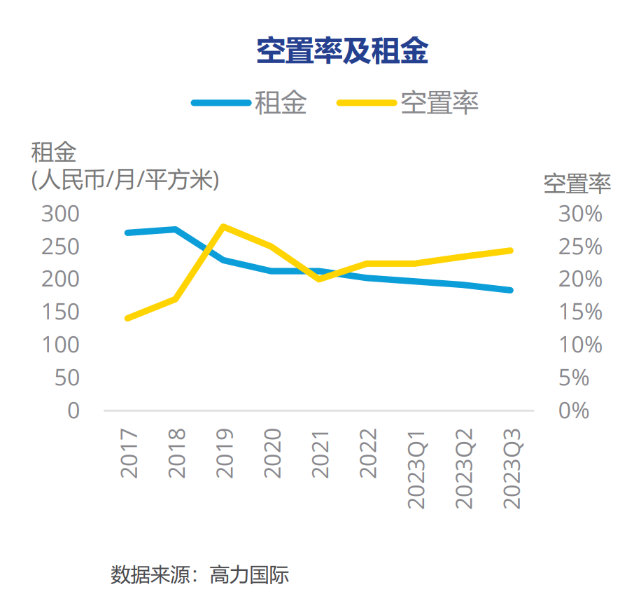 大家可以看下面这张图,实际上随着空置率上升,房租的价格从2017年之后一直是不断下滑的。