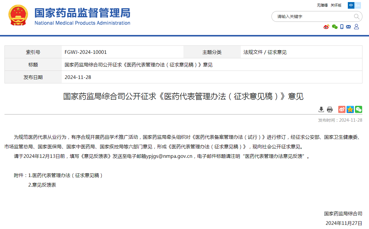2024年11月28日,国家药监局发布了《医药代表管理办法(征求意见稿)》,详细规定了药品上市许可持有人、医疗卫生机构及其工作人员,以及医药代表的行为准则。