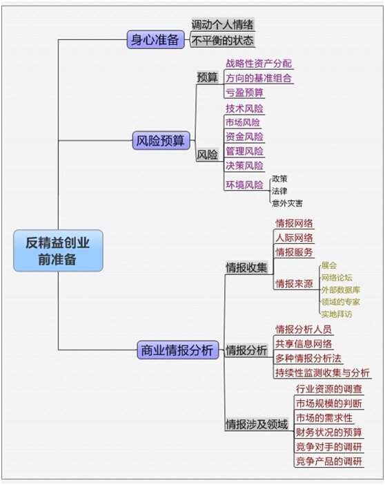 在对反精益创业有了全面详尽的客观了解后,就要开始着手于创业前准备。首先是要进行身心准备,创业前期要充分调动个人情绪,使自己时刻处于一种激情燃烧的不平衡状态,而不是休养生息。这就像竞赛之前需要热身,并保持轻度饥饿,而不是饱餐一顿。人的情绪一旦被激发起来,那么潜能是巨大的。为什么要使自己处于这样的状态?这是因为当人意识到不平衡的时候,才会想去找突破口去发泄,以期构建完整平衡的心理状态,我们心理学上称之为“完形”(见于格式塔流派,并为多个心理学理论所接受)。如何去激发调动这样的情绪,这里我们可以借鉴弗洛伊德的著名心理学理论——阉割焦虑,它原意是指男孩到生长发育的某一阶段,害怕被阉割后缺少身体的某一重要部分,恐惧自己身体的不完整。我们这里提到的阉割焦虑是指我们要把完成这项事业必胜的决心,必做的事情,必须拥有的信念等这些重要的价值观,通过自我营销的方式变成我们身体和精神的一部分,并且有可以随时离我们远去的风险意识。那么在此种情况下,就像害怕我们失去身体的一部分那样,人本能地就会要竭尽全力的保持自我的完整,动员全部身心,而往往奇迹就是这样创造的!