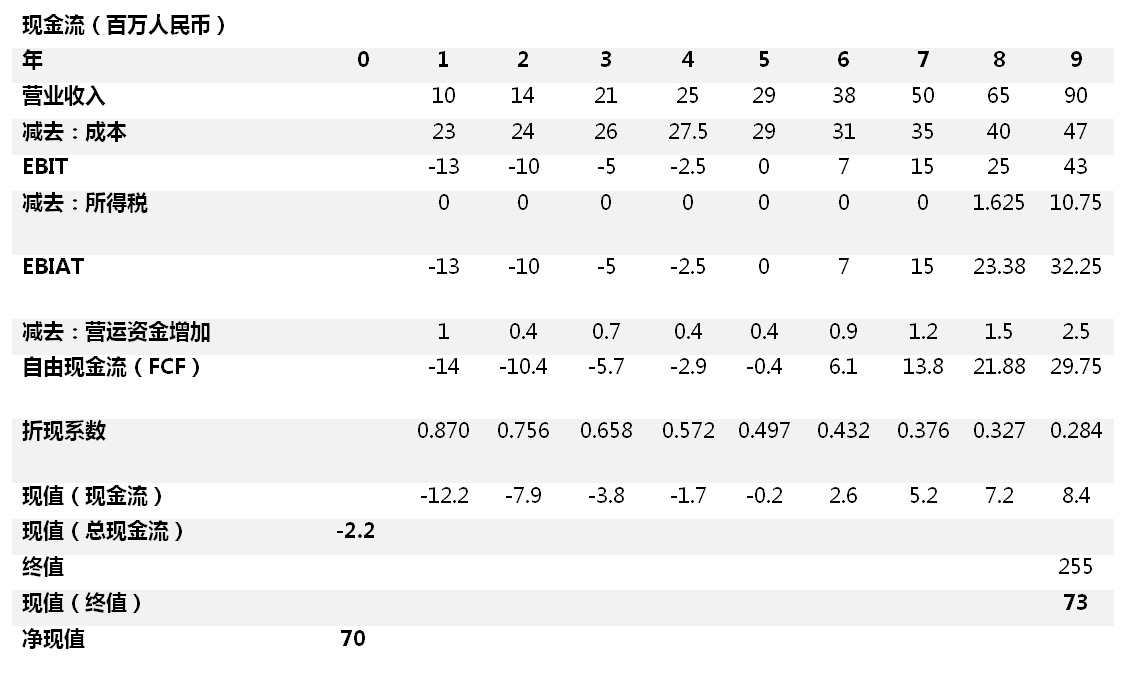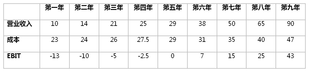 A同学发现早期的负向现金流以及数年后才出现的正向现金流对贴现率和永续增长率的变化非常敏感。 A同学虽然用了净现值法作为估值的第一步, 他意识到他必须用其他方法来进行修订。