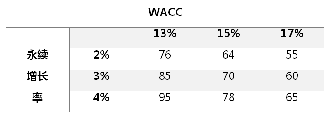 然后A同学根据贴现率和永续增长率的变动做了一个敏感性分析(见下表)。这个敏感性分析给出了一系列的公司价值(从0.55亿到0.95亿)。A同学将敏感性分析得到的九个估值做了一个加权平均,得出“十三幺”的价值大约为0.72亿元人民币。