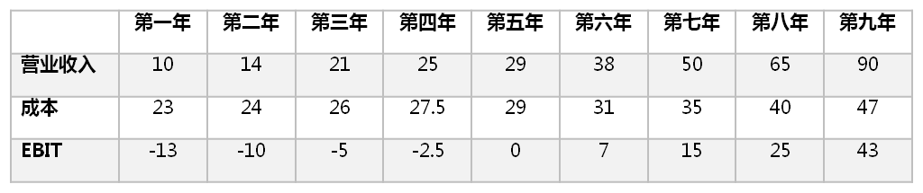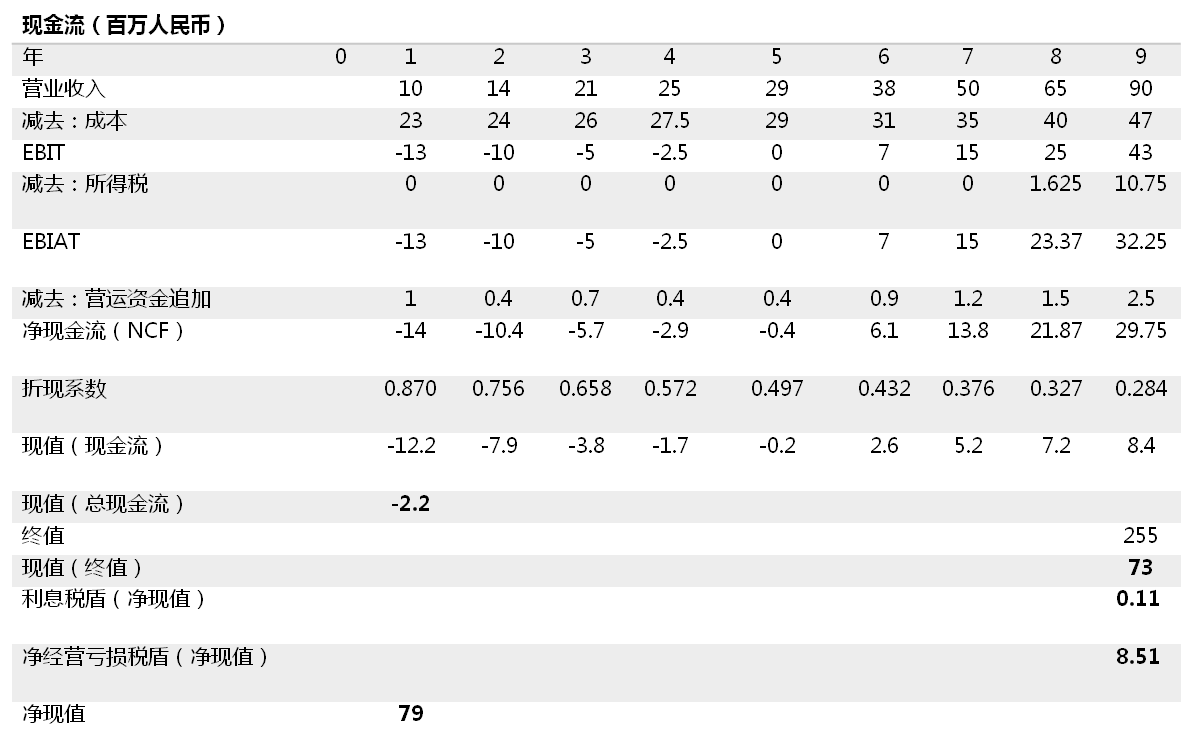 然后,A同学计算现金流和终值, 这和净现值法的算法一样,终值是2.55亿元人民币。 A 同学下一步就是要计算出利息税盾,这个计算很简单,就是每期的利息费用*所得税率。 利息则用还款计划计算。 利息税盾的现值为10.6万元,这是每年的利息税盾按照银行利率折现算出的。A 同学还计算了净经营亏损的税盾。 净经营亏损税盾的现值为850万元,是按照银行利率贴现算出的。敏感性分析则告诉我们“十三幺”的估值范围在0.64亿元和1.04亿元之间 (见下表)。