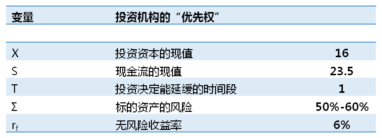 通过B-S期权定价模型的计算, 得出认购期权价值大约在939万到991万之间。 这个项目总净现值是第一期资本支出现值(-400万)与第二期认购期权价值之和 ,即是:总净现值=(-400万+939万到991万), 取中值为565万。