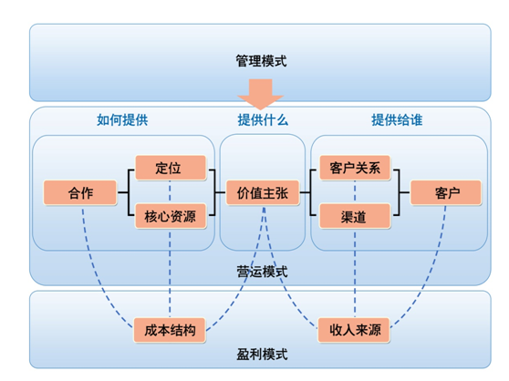 我们可以将商业模式分成三个部分: 营运模式,盈利模式以及企业管理模式。这三个部分相互支撑,密不可分。