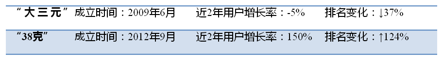 从A拿出的上述数据显示,“大三元”的成立之间较之“38克”早了三年,但是网站综合排名、活跃率与点击量都不如“38克”。更为严重的问题是,虽然一直有少许盈利,但“大三元”从前年开始,在用户基数刚刚超过运营平衡点的时候,就出现了明显负增长,网站排名也是直线下降,其覆盖力与影响力已经远远不如其他同行业网站,目前的盈利不过是靠创始人的个人关系以及一些历史合同的延续,而今年合同就要到期了。此消彼长,反观“38克”网站在近两年内,出现了用户数量的快速增长,并且网站排名有爆发式直线上升的趋势,用户绝对数已经大大跨越了行业内企业的平均基数。同时,在微博方面,“大三元”的微博粉丝数量虽多,但是粉丝活跃度明显较低,如此“僵尸粉”纵横的微博,显示了其在行业内各种竞争对手的压力之下,毫无还手之力,持续经营能力堪忧,而且“大三元”有员工10人,而“38克”仅有6人,团队较之前者更轻更富活力。