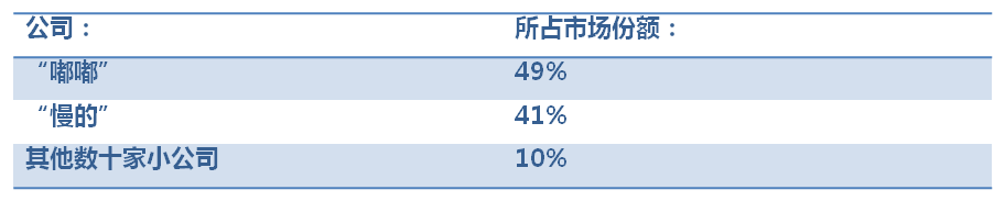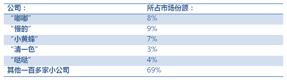 可以看出,大批在之前有一定市场地位的公司出局,而“嘟嘟”和“慢的”两家公司将占领市场90%的份额。