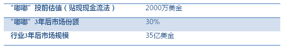 听了以上四点理由,B同学被说服了,但是他又抛出了新问题:投资的1亿美金是怎样算出的?A同学做了如下推演,行业5年后可以到达100亿美金的估值,那么我们取一个双方都认可的,整个行业3年后的整体估值和“嘟嘟”公司的市场份额作为估值中枢。在3年后大概如下所示: