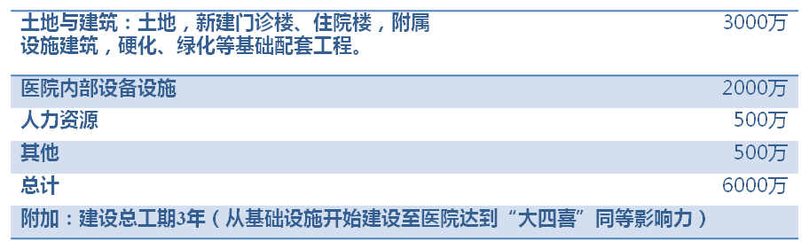 A同学首先列举了假设“二百六”要重新从0开始建立一家与现在医院具有相同规模和发展状况的新医院所需要的资金:(单位:元)