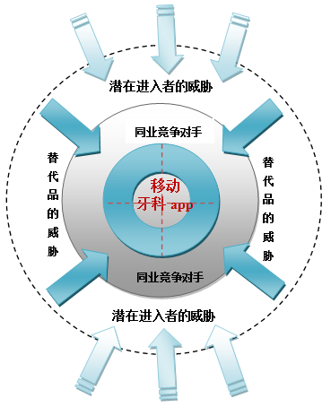 移动牙科类app的商业模式,基于传统的O2O平台,未来很有可能会打通牙科诊疗机构(民营医院和私人诊所)以及牙科种植类材料厂商的通道,形成“中介”的角色(类似淘宝),在产品(移动端软件或web端)上提供信息导流、用户购买意见、客户随访信息、口腔招聘服务等内容,从而获得一部分广告收益;另外一种,因为较传统公立医院不同,多数的牙科医院是民营机构和私人诊所,其收入完全依靠牙科患者的治疗费用,但牙科的刚性需求并不高,并且部分就诊是不在医保的范畴的。所以未来也可能与民营牙科诊所营利分成,按照就诊业绩获得部分收益。下面,我们将着重分析移动牙科app的竞争要素,从同业竞争对手、替代品的威胁、潜在进入者和退出者的威胁三个方面重点分析,这也是所有分析要素中最重要、最核心的影响因素。