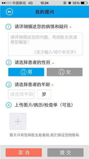 选择“问医生”,进入提问阶段。用户输入疾病描述、性别、年龄、照片(选填)后提交。