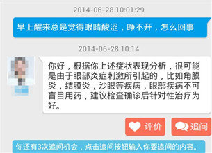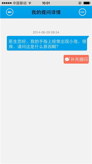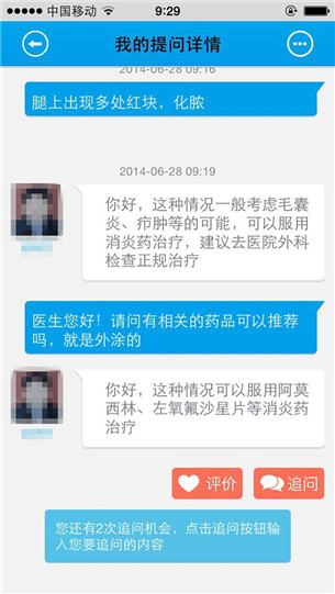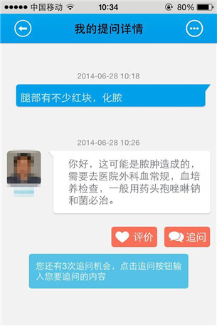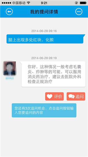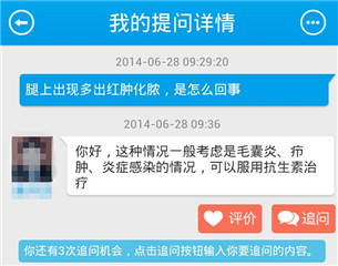 两三分钟之后,医生回复提问,此时,用户拥有3次追加提问的机会。回复速度在10分钟左右,并且同一个问题,我们来看一下医生的回答。