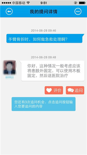 7、将未被回复的急救问题,骨折如何急救再次贴在“问医生”里面,重复提问,将问题按照描述、性别和年龄提交出去。3分钟内回复的还是一开始回答我们第一个皮肤科问题的医生,因为当前她在线。