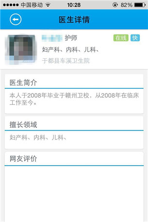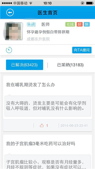 9、然后我们再选择一位活跃度最高的医生,对她进行同一时间不同问题的提问,这位医生显示当前在线。但半小时后,四部手机均未回复。