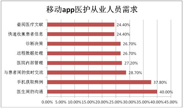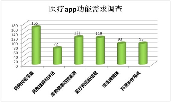 在我们面向医务工作者的调查结果中,病例快速采集第一;患者健康远程监测第二;医疗资讯新进展第三。这与2013年公开发表的数据结果不太一致,我考虑可能有以下几个原因:1,样本基数和抽样代表性不同,因为影响力所限,我们只调查了245名医务工作者,并且多数是医生。2,调查结果滞后性的系统误差:移动医疗医生入口主要的几个app产品在近1-2年内才刚上线,医生的使用和接受是一个过程,经过不断市场培育和用户使用的习惯的改变,部分需求也发生了变化。