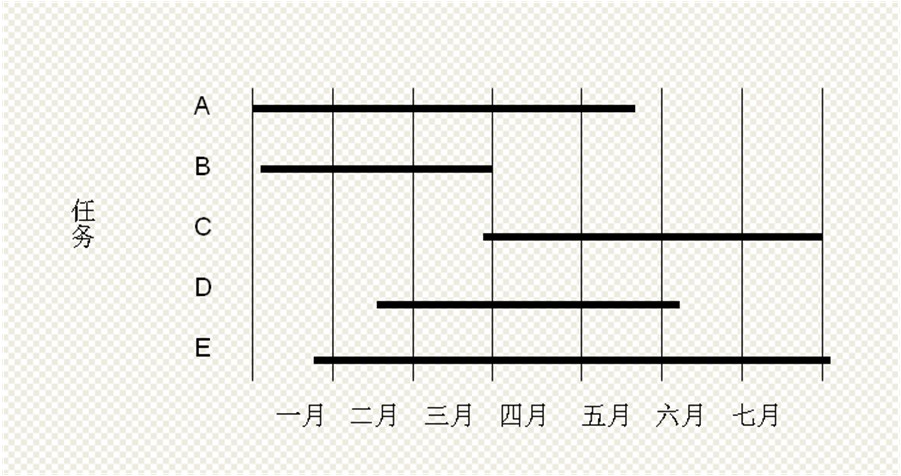 下图是甘特图的简单图示,它基本是一条线条图,横轴表示时间,纵轴表示活动(项目),线条表示在整个期间上计划和实际的活动完成情况。下面这个示意甘特图表述的意思是,有ABCDE五个项目在1-7月之间的实施计划,完成的起始时间等信息。