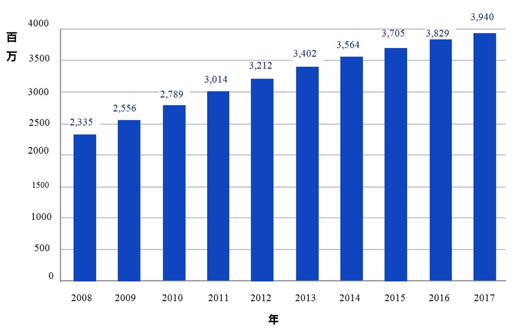 自2008年以来移动用户数量急速增长,且在未来长时间内将保持增长趋势。根据GSMA发布的2013年移动经济报告,移动用户数量从2008年的23亿增长到2013年的34亿并且有望在2017年超越39亿(见图1)。