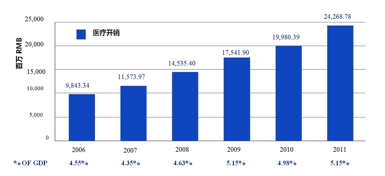 论是在中国还是美国,医疗费用都飞速增长。中国2011年的医疗费用占了GDP的5.15%。中国在2006年到2011年之间每年的医疗开销,该项支出