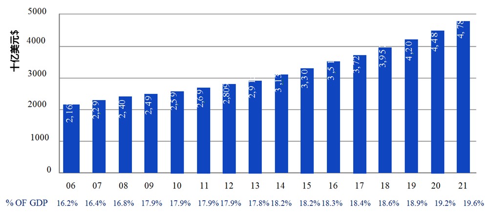 在美国,2013年的医疗服务总支出约2.9万亿美元,并且有望到2021年时提高至4.8万亿美元左右(见图3)。医疗服务支出占GDP总量的比例有望从2006年的16.2%提升到2021年的19.6%。