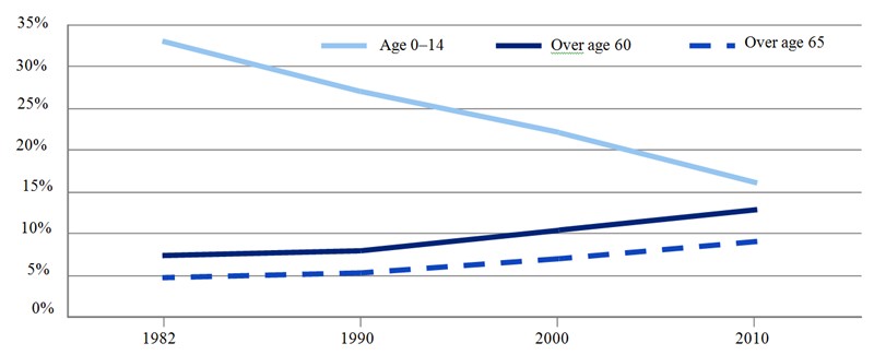 中国和美国同时都面临着人口老龄化问题。对于中国,现有人口的8%在65岁以上(见图4)。对于美国,3.1亿人口中有4千万人(合12.9%)的年龄在65岁以上。由于婴儿潮一代人的退休,美国的这一比例预计将提升至20%。