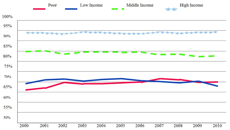 图6:美国不同收入水平人群医疗保险比例的差异,2006-2010