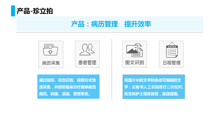 们是平台型产品,涵盖了医生多种需求,病历采集只是冰山一角。而病历夹是以病历采集为主的一款医生工具APP。就病历采集而言,我们自己开发了一套图文识