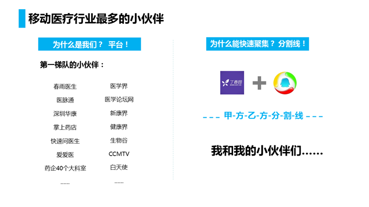 另外我们做医生平台,爱爱医和医脉通也是,为什么我们也能和他们合作呢?因为我们有一个共同的对手丁香园,他太强了,所以敌人的敌人就是朋友,你们懂的!