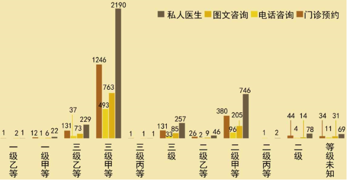 如上图所示,开通空中医院中四项服务的医生人数分布中,来自三级甲等医院的医生数量远远高于非三甲医院的医生。春雨医生中的空中医院共分为四项,分别是私人医生、图文咨询、电话咨询、门诊预约。