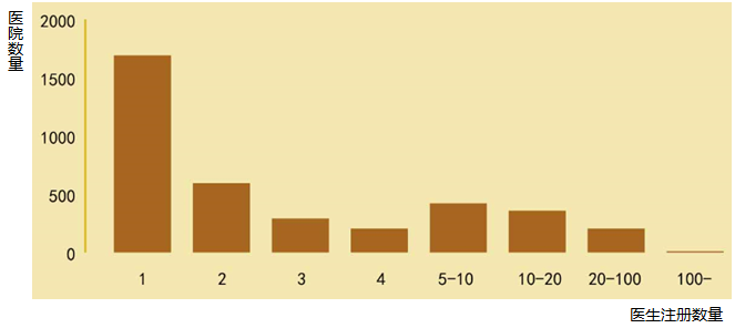 各医院的医生在春雨上注册的人数,从上图可以看出,仅有一位医生注册的医院有1690家,有2位医生注册的医院数量有593家,有5-10位医生的医院数量为420家,10-20位医生的医院有358家,超过100位医生的医院仅有8家,这8家医院分别为阜外心血管医院324名医生、福建省立医院132名医生、新疆自治区人民医院119名医生、武警总医院118名、河南省人民医院107名、潍坊医学院附属医院106名、潍坊市第二人民医院104名、郑州大学第一附属医院102名。