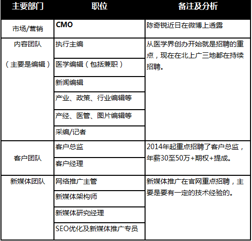 目前医学界内部团队有30人左右,其中2/3是内容生产人员,有独立采编,其余员工做内部服务、外部推广等,所以这还是一个标准的传媒团队架构。据称医学界外部有约50名兼职人员,还与一些自由撰稿人合作。