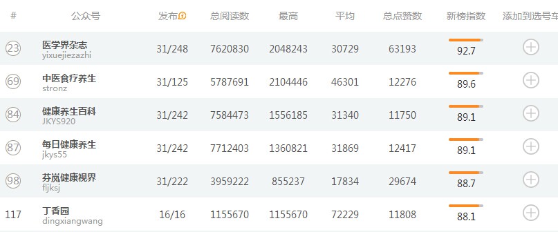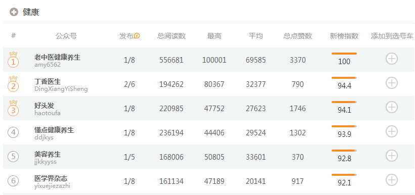 根据newrank.com的健康类订阅号排行榜,我们发现:医学界杂志流量排名医疗类媒体第一,领先丁香园近7倍。