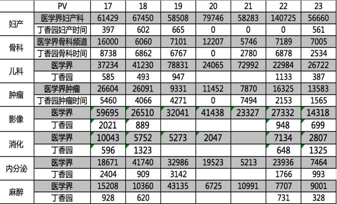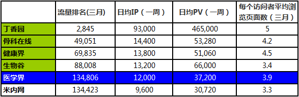 从这个指标来看,医学界网站UV只有丁香园网站1/7,日均PV只有丁香园1/10。