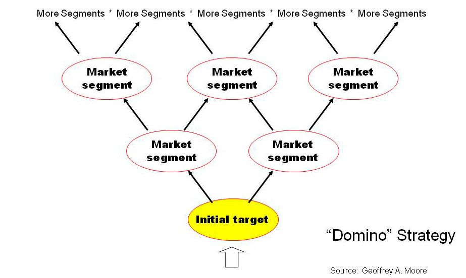而在那里,“鸡和蛋”的问题就比较容易解决。那么解决之后呢?那当然是以这个小众利基点调动其他小众利基点,最终推广到整个市场。(如下图所示)