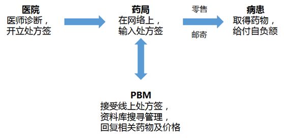 a. 患者在医院买药:医生开处方选择药品,PBM审核处方迅速反馈,给医生用药建议(PBM协议的药品),当医生为PBM患者配药时,通常只收取患者少量的付
