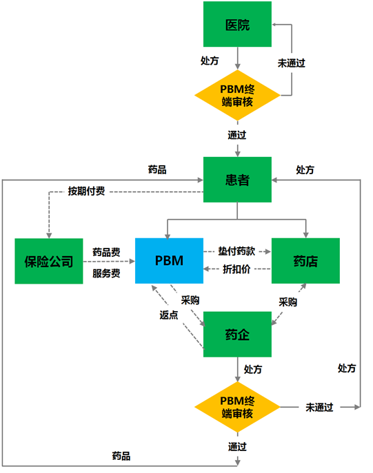 款,然后向PBM递交一份赔付申请,索要剩余的应付款,PBM根据协议的药品支付给医院,再将自己垫付的费用及少量管理费的发票递交给保险公司等(医生随