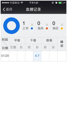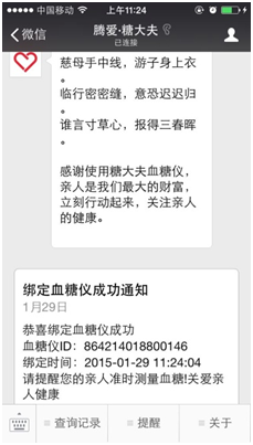 查询记录:血糖仪上的测量结果可以同步到绑定的微信号上,可直接在微信号上查看血糖测量结果(目前可查看近三天、一周、两周)。