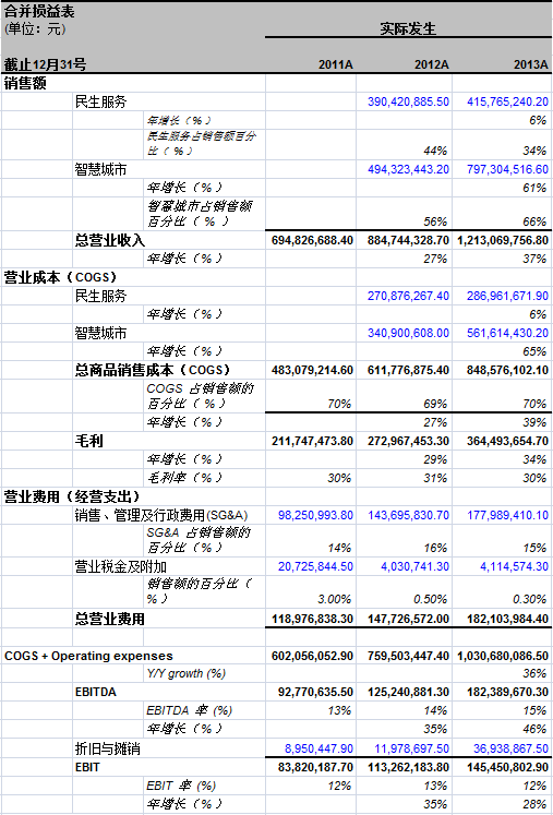 表1:调整后的万达信息过去三年合并利润表(2011-2013)
