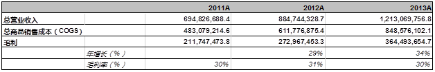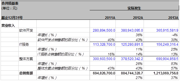 整体方案的收入则在2013年同比大幅提升83%,其在营业收入中占的比例也由2011年和2012年的45% 猛增到2013年的57%。