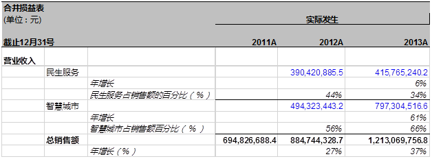 2013年,民生服务的收入同比增长6%,但其占营业收入的比重则从2012年的44%下降到34%。相反,智慧城市在2013年则大幅同比增长61%,