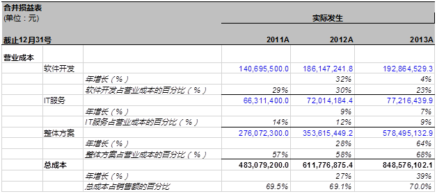 IT服务的成本在2013年的同比增长也有所减缓。占总营业成本的比例也进一步下滑。而整体方案成本的同比增长则有2012年度的28%急剧上升到