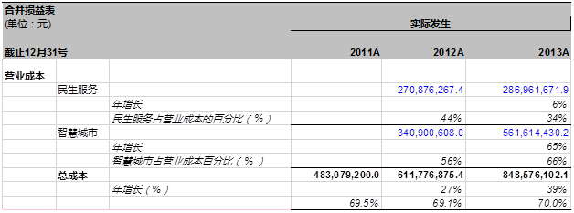 2013年民生服务的成本同比增加6%,其占总营业成本的比例则从2012年的44%下降到34%。相反,智慧城市成本在2013年则大幅同比增长65%,占总营业成本的比重也从2012年的56%上升到66%。