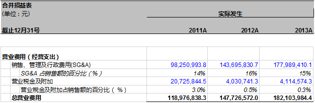 而万达信息的销售,管理及行政费用(而万达信息的销售,管理及行政费用(SG&A)占营业收入的比例在过去三年一直都比较平稳,分别为 14% (2011), 16%(2012)以及15%(2013)。