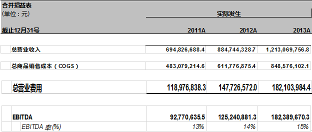 我们首先在巨潮咨询网下载万达信息过去三年的合并利润表。此表是严格按照中国会计准则要求的格式编制,因此没有计算EBITDA和EBIT,他们是一种利润衡量指标。于是我们下了一些功夫,将过往3年的数据逐项分解后调整,然后重新组合并在一起。见表1: