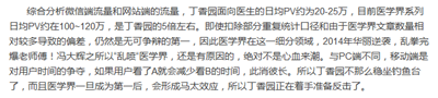 不得不拓展患者端的数据,发展丁香医生及子号,通过广点通等手段拉人头。而丁香园的医生端早就已进平台期,看不到实际增长,当然如果他说的200万医生用户为真的话(相当于整个中国医师协会的医生会员数),也可以理解。