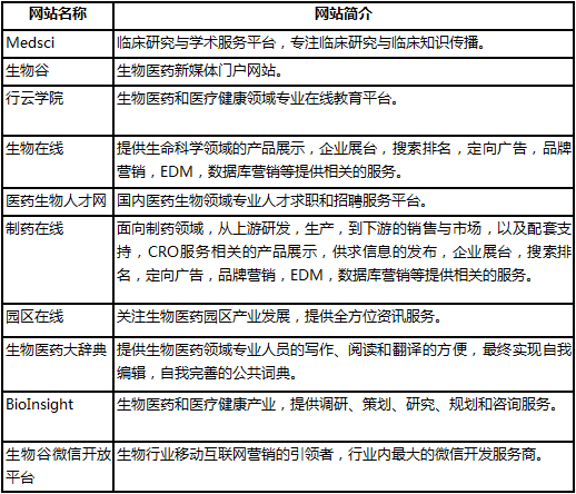 因此可见其业务链较为广阔。像生物谷网站,制药在线,生物在线,医药生物人才网还有医药生物汇展网等网站的目标个体受众就是广大生物医药专业科研人员、临